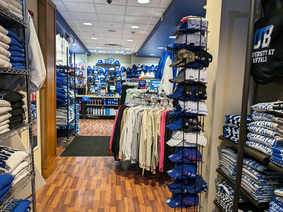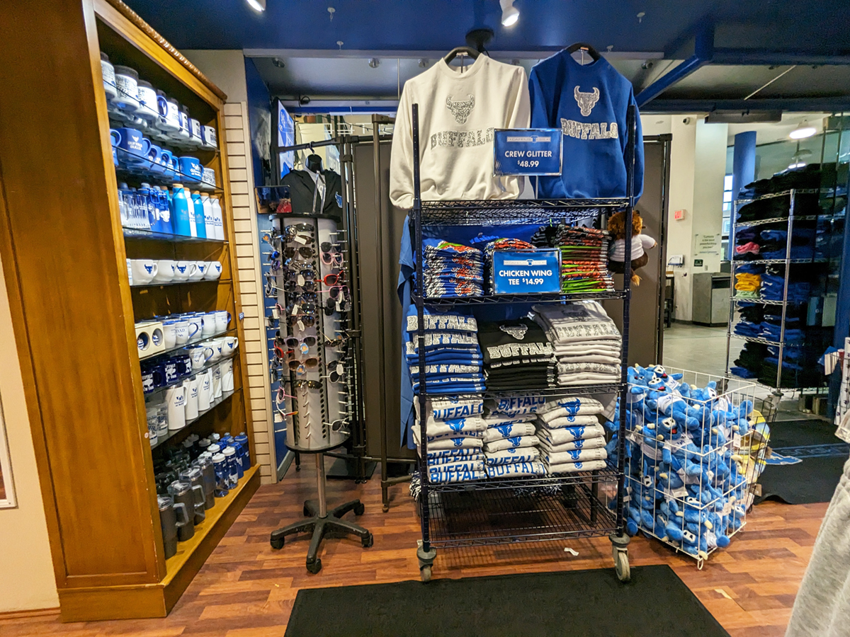 Inside of the Campus Tees store full of apparel like sweatshirts, sweatpants and Victor E. Bull plushies.