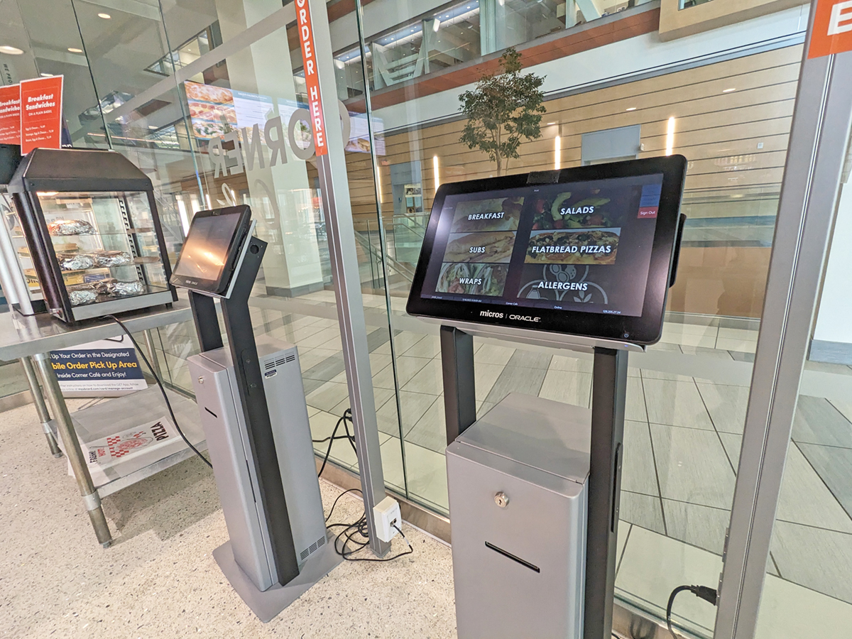 Two ordering kiosks next to the breakfast sandwich warmer. They are on the landing page where you can see categories: Breakfast, Subs, Wraps, Salads, Flatbread Pizzas and Allergens.