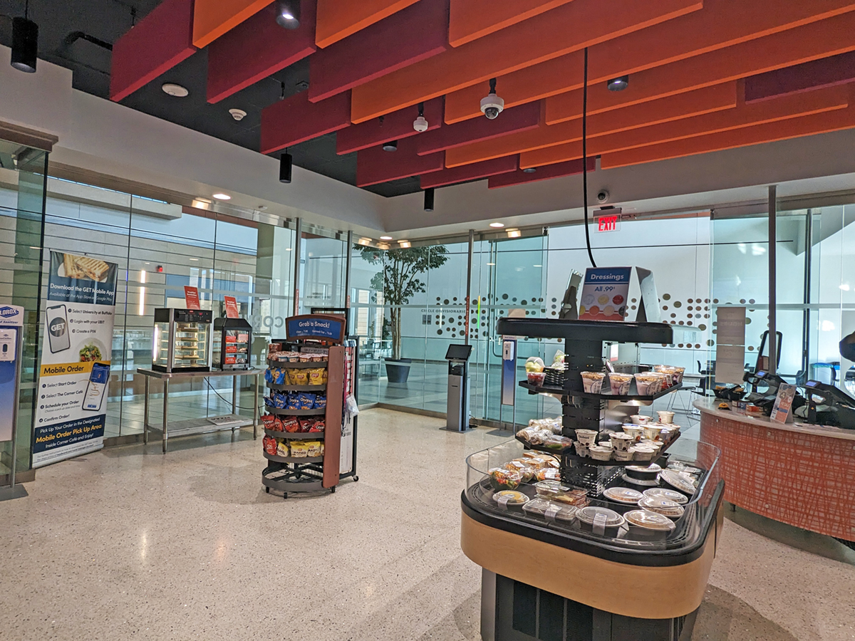 The interior of Corner Café at JSMBS. You can see some grab & go items, a snack shelf, a breakfast sandwich warmer, and one of the ordering kiosks.
