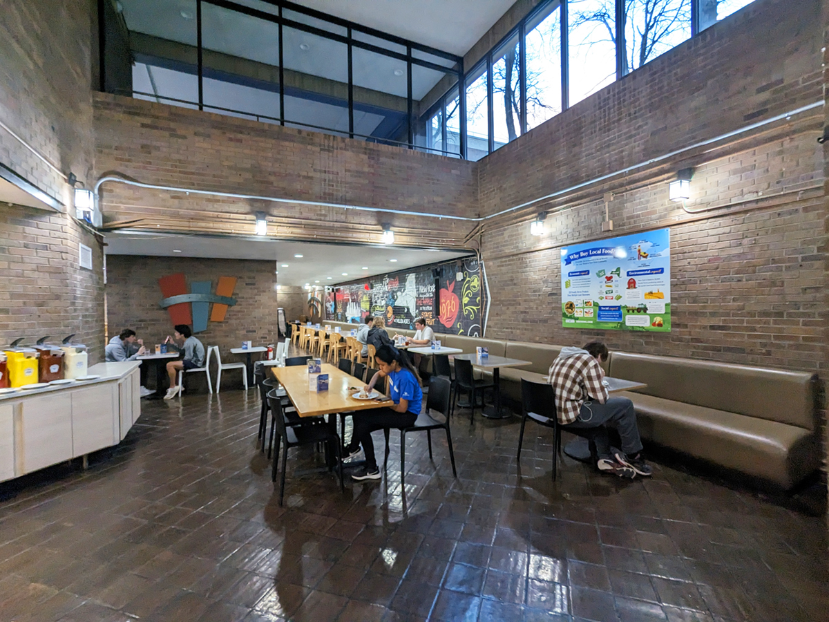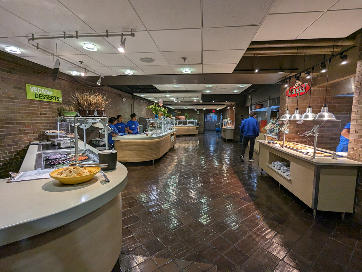 Walking into Governors Dining Center. Vegan and vegetarian options at Portobello Road are to the left and pizza at Mangia is to the right.
