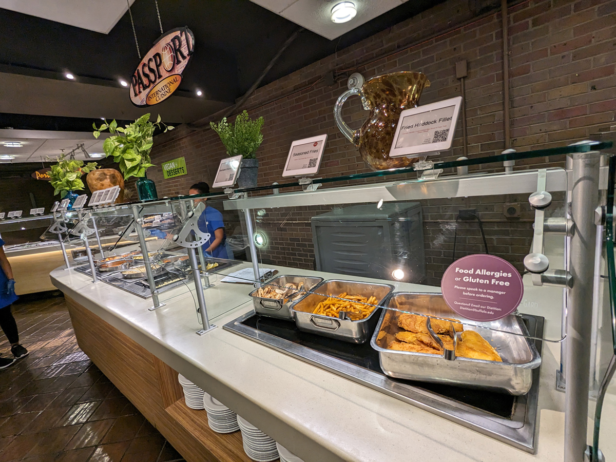 Passport station at Governors Dining Center, which serves international cuisines. A fried food section is next to it with fried haddock fish and fries.