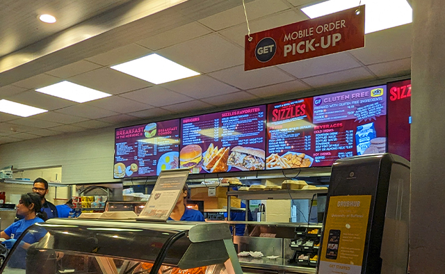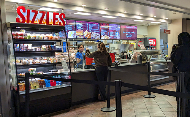 What a grill we've got! Meet us at Sizzles in the Ellicott Food Court for breakfast and try our fresh eggs, sausage, bacon and hash browns. Our lunch and dinner options feature hot, grilled sandwiches, made just how you want them. Additionally, find boneless wings, fries seasoned to perfection, and a variety of sodas to wash it all down.