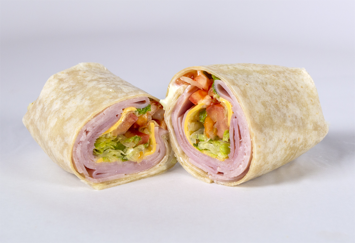 A ham wrap with tomatoes, lettuce and cheese on a white tortilla.